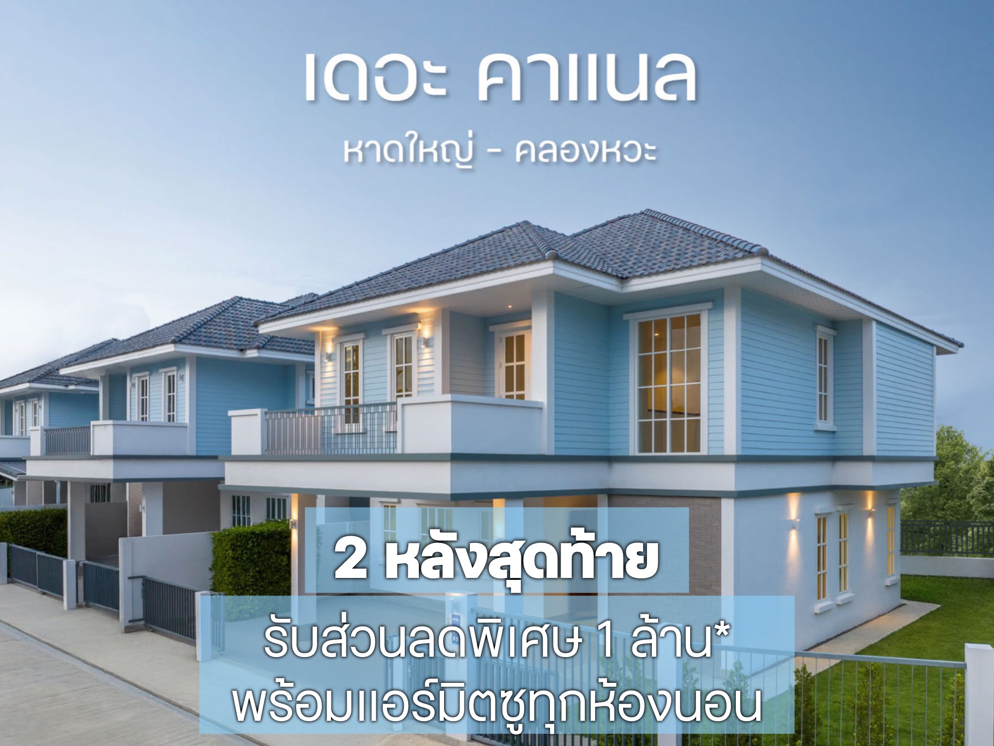 บ้านเดี่ยวเดอะคาแนลหาดใหญ่ บ้านหลังใหญ่ไทป์A 3หลังสุดท้าย ราคาเดียว 6.8 ล้าน รับโปรโมชั่นสุดพิเศษ ส่วนลดสูงสุด 5 แสน* ฟรีแอร์ทุกห้องนอน ฟรีค่าโอน ฟรีกระจกแทมเปอร์ทุกห้องน้ำ ฟรีมิเตอร์น้ำไฟ ฟรีสวน ฟรีเคาน์เตอร์ครัว ฟรีเครื่องดูดกลิ่น